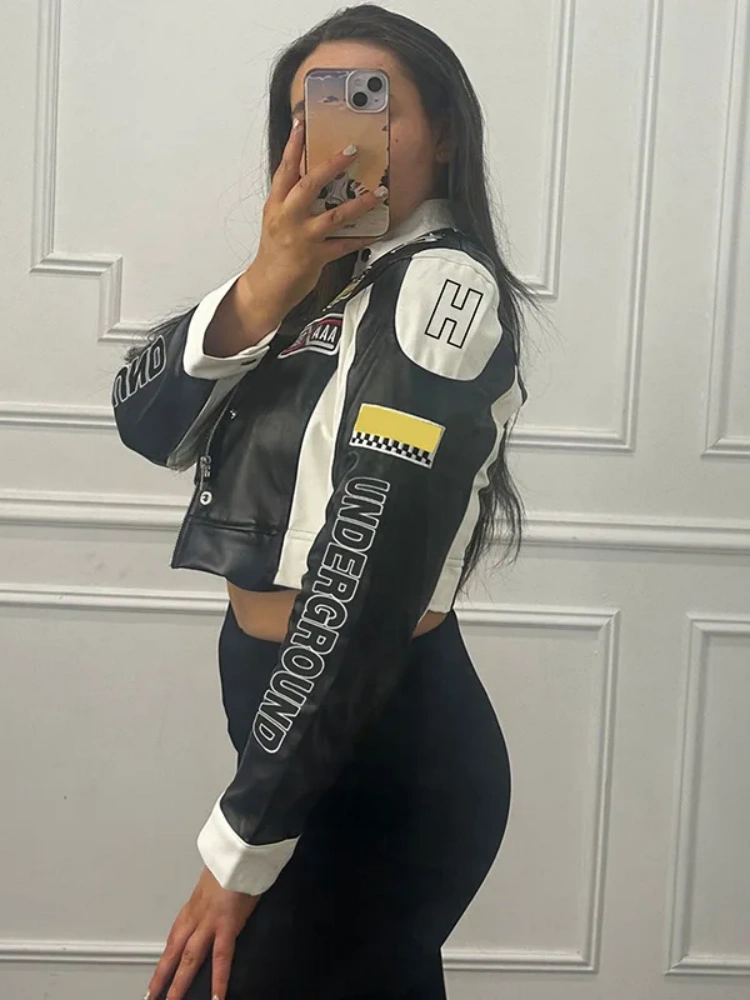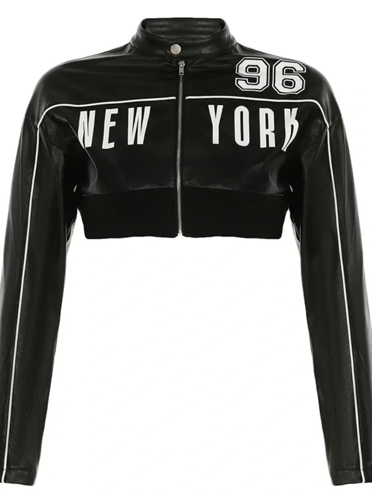 BOOFEENAA Letter Print Black PU Leather Jacket Streetwear Autumn Winter Clothes Woman Trendy Zip Up Cropped Jacket D56-DI27
