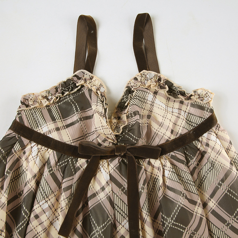 BOOFEENAA Brown Plaid Tank Tops for Women Gyaru Japanese 2000s Y2k Summer Bow Frill V Neck Backless Top Cute Clothing P84-CH14
